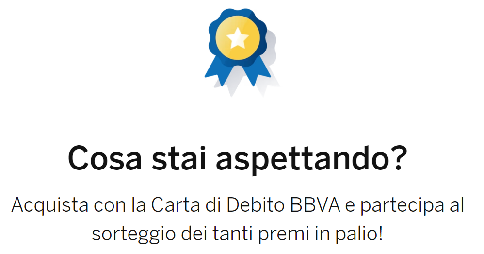 Sorteggio quindicinale: Ogni 15 giorni sorteggiamo 100 Buoni Regalo Amazon.it da 50€*. Per partecipare al sorteggio dovrai solamente effettuare un acquisto di qualsiasi importo con la Carta di Debito BBVA. Possibilità di una sola partecipazione per ogni sorteggio quindicinale. | Sorteggio trimestrale: Ogni 3 mesi sorteggiamo un gran premio. Il prossimo premio messo in palio è una Gift Card Volagratis.com dal valore di 6.000€ (IVA inclusa)**. Per partecipare al sorteggio effettua acquisti con la Carta di Debito BBVA e potrai accumulare partecipazioni. Hai tempo fino al 31 dicembre. Più partecipazioni accumuli, più probabilità avrai di vincere una Gift Card Volagratis.com per acquistare voli, soggiorni in hotel o pacchetti volo + hotel. |