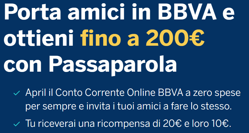 BBVA è un nuovo conto online, completamente a costo zero, con il quale è possibile quadagnare 20€ in credito reale, utilizzabile per qualsiasi acquisto. Ricevi una ricompensa di 20€ per ogni amico invitato e loro ne ricevono 10€.